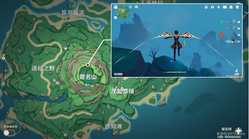 13、雷灵3:从菅名山下方利用召唤雷种子出现的雷极以及攀爬,爬到图示标记位置的山顶,就能看到第3个雷灵(我是在菅名山最高点放了1个锚点,因此直接从锚点传送后飞过去即可)