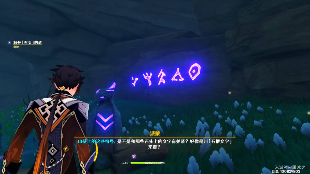 3.解开石头的秘密。使用羽毛会出现雷灵,走到终点有解谜提示。