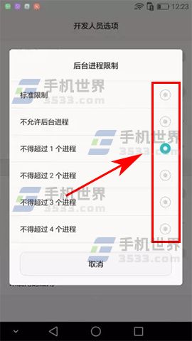 2)在开发人员选项里面找到【后台进程限制】,点击后就可以对进程的数量进行选择限制了。(如下图)