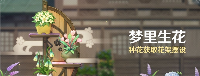 活动期间,在「咲耶」处兑换花种并种植「梦里花」,即有机会获得三种外观风格的「花架摆设」、原石等奖励。