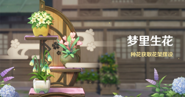 活动期间,在「咲耶」处兑换花种并种植「梦里花」,即有机会获得三种外观风格的「花架摆设」、原石等奖励。