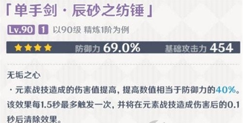 元素战技造成的伤害值提高,提高数值相当于防御力的40/50/60/70/80%。该效果每1.5秒最多触发一次,并将在元素战技造成伤害后的0.1秒后清除效果。