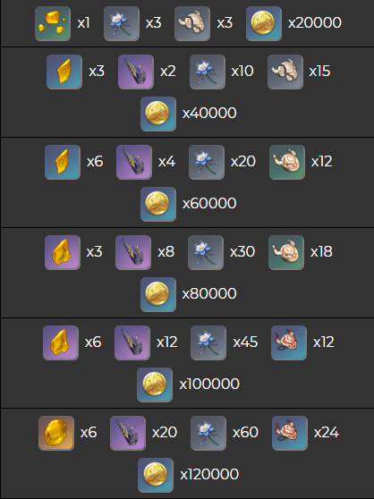 80级:坚牢黄玉*6+兽境王器*20+琉璃百合*60+不祥的面具*24