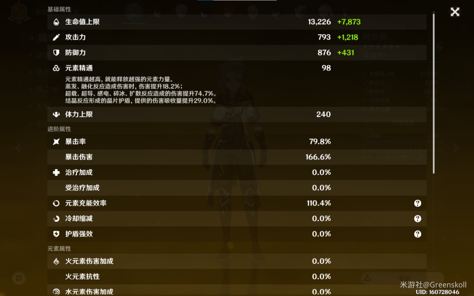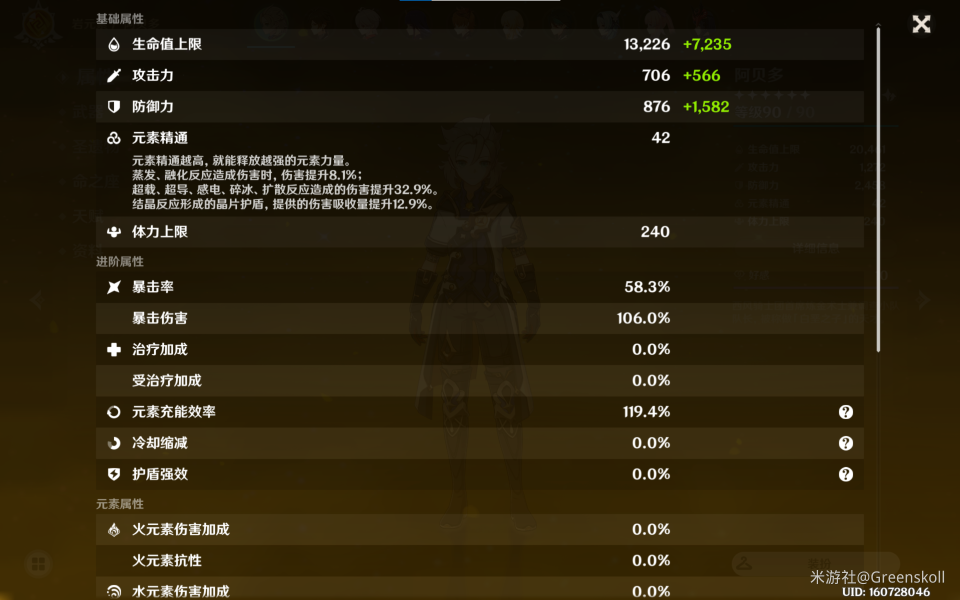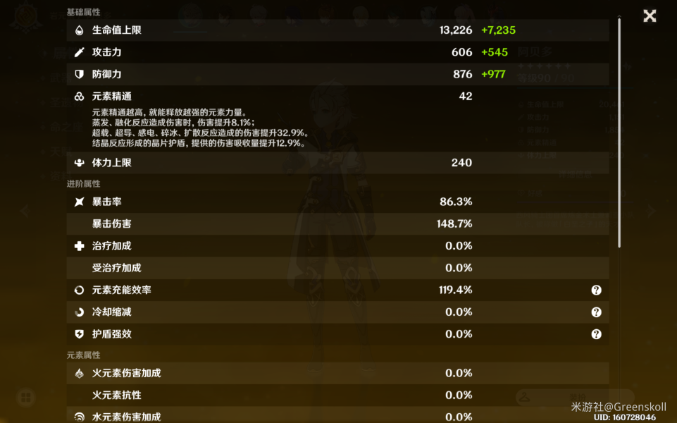 然后是(1精)磐岩结绿的测试。攻击流阿贝多不是正道,厨力玩家打个乐子。