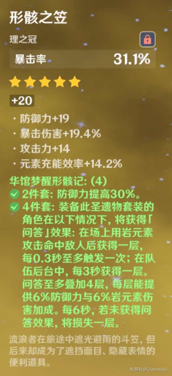防岩暴(时之沙-防御力;空之杯-岩元素伤害加成;理之冠-暴击率)