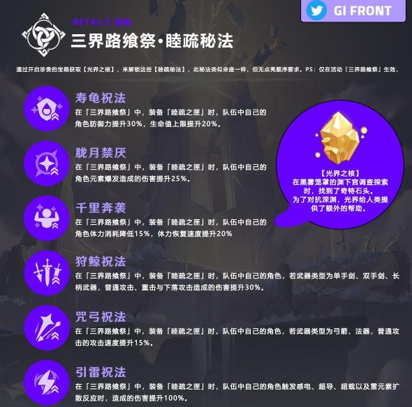 玩家可以通过开启珍贵的宝箱获取【光界之核】,来解锁这些【睦疏秘法】,此秘法类似命座一样,但无点亮顺序要求。仅在活动「三界路飨祭』生效。