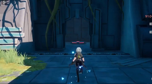 一进入遗迹的正前方房间中,右拐就能刚看到,在宝箱的前面有一个机关门,去踩红色的机关,门就会打开。