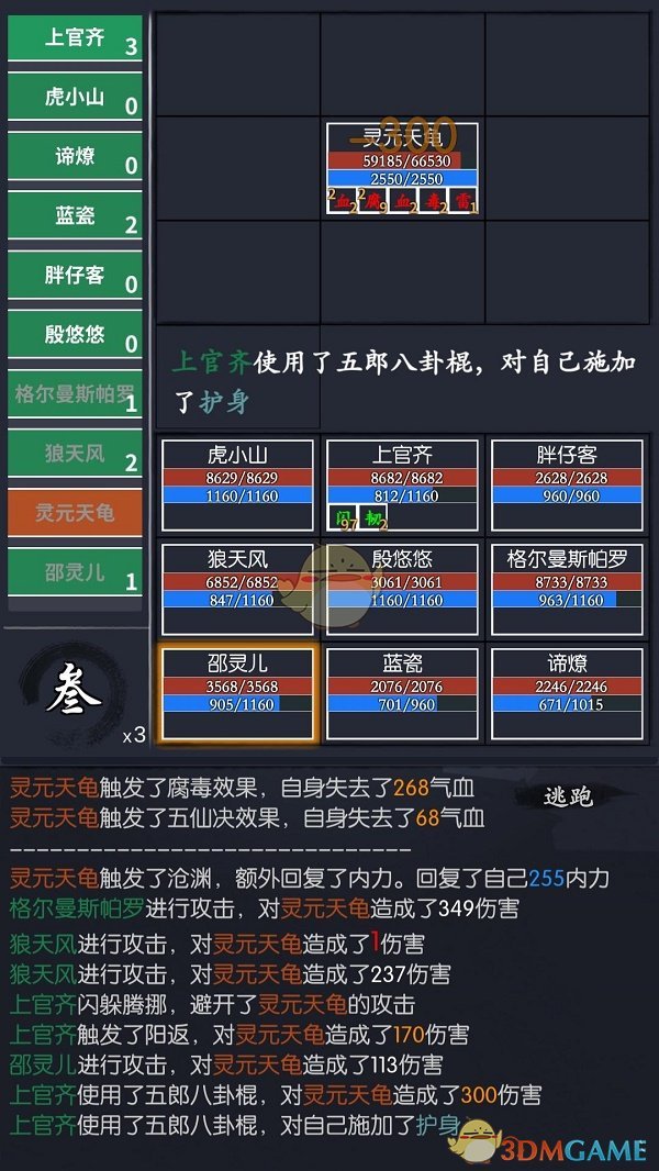 2、灵元天龟6万多血,血量降到20000多的时候,掉血会用蓝抵消,每一点蓝可以抵消7点伤害,它每回合都回百分之十几的蓝,所以直伤流是打不死的。