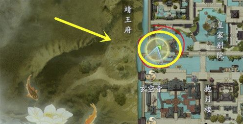 报恩塔坐落在“京城”,坐标是(696.1076),如下图所示:
