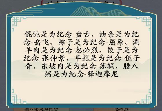 馄饨是为纪念盘古、油条是为纪念-岳飞、粽子是为纪念-屈原、涮羊肉是为纪念忽必烈、
