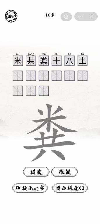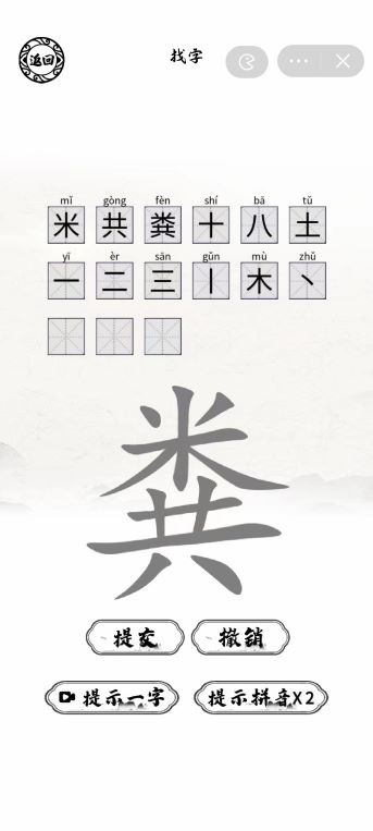 1、在粪字中找出15个字答案:【米、共、粪、十、八、土、一、二、三、丨、木、丶、丷、䒔、艹】
