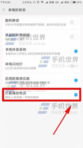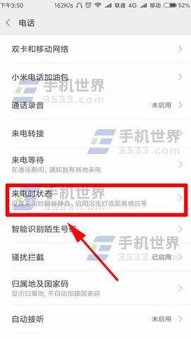 2)接着点击【来电时状态】,最后将【拦截骚扰电话】那栏右边的椭圆往右拉打开即可。(如下图)