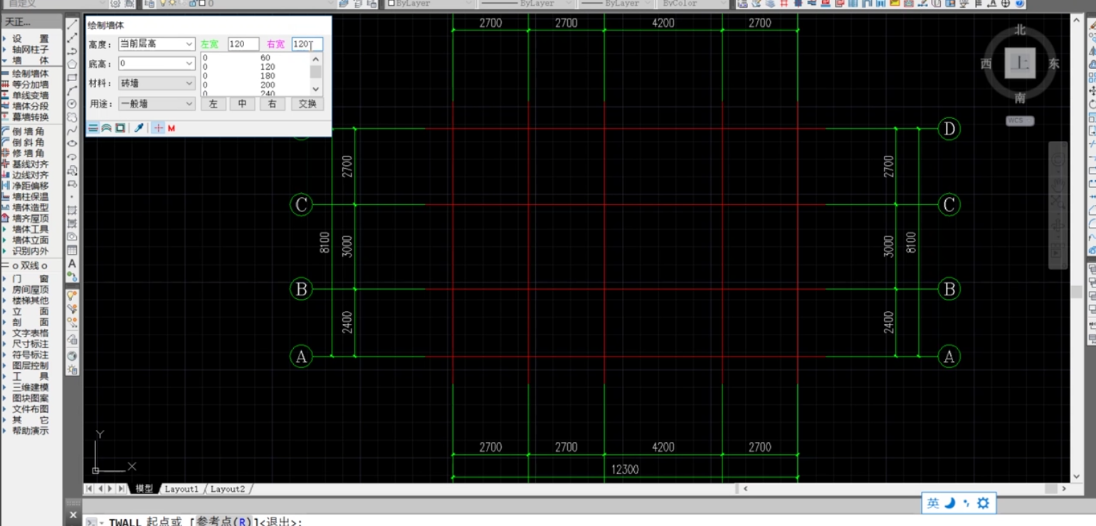 2、然后在左侧绘图工具栏中点击“墙体”在弹出的选项中点击选择“绘制墙体”,系统弹出墙体设置窗口。