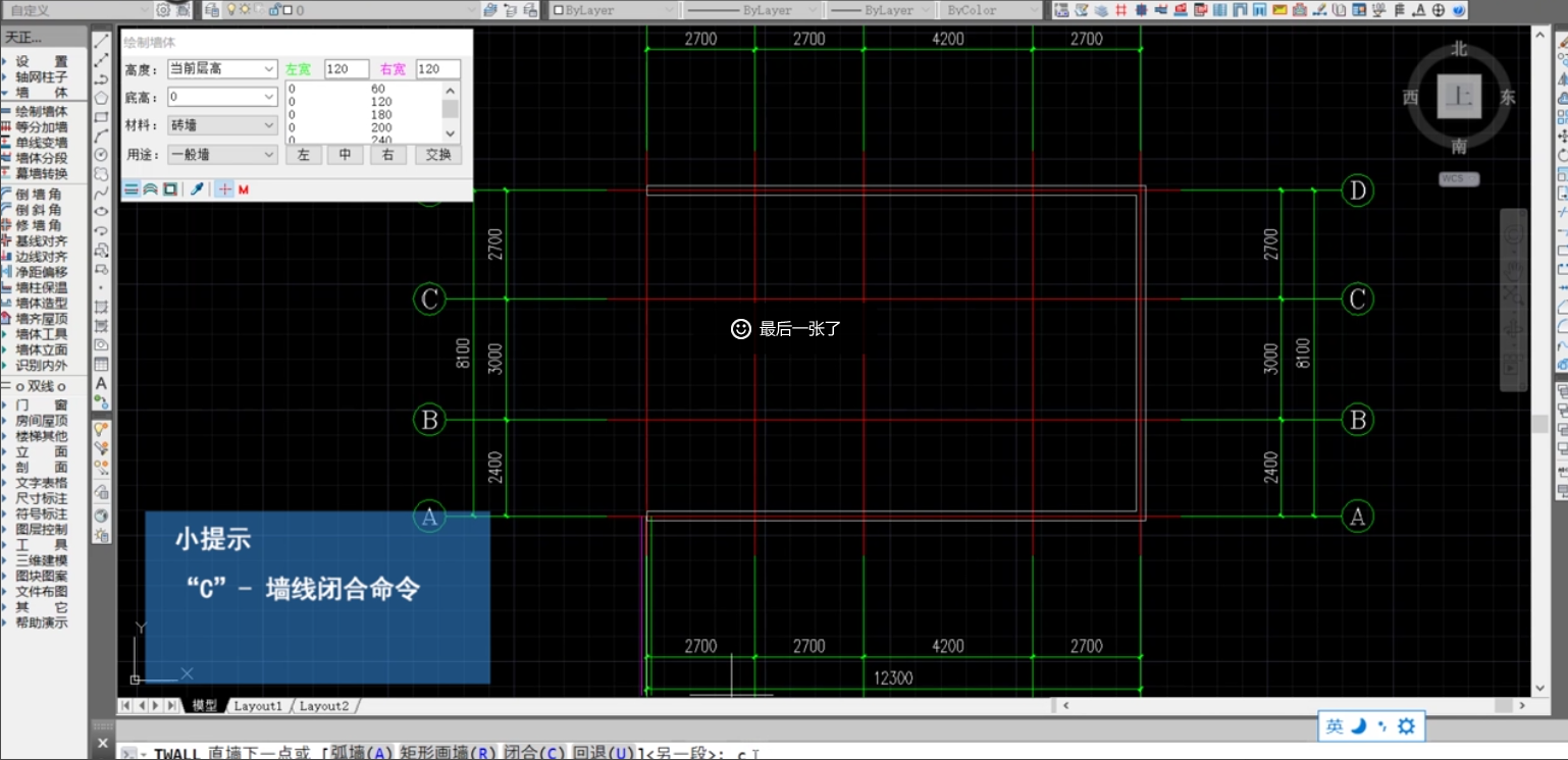 5、完成墙线绘制后我们可以在命令栏输入闭合快捷键“C”,按下“空格键”确定,墙线就会自动连接起点完成墙线绘制。