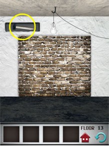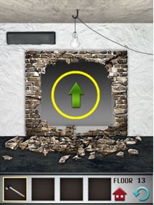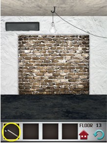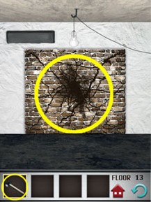 13关电梯前面有一堵墙,墙的上方有一把锤子,只需要晃动手机,锤子落在地上,将其捡起,放在储物箱,在点击储物箱中的锤子,在墙上开始不停的敲,知道墙破裂,电梯门也就打开了,进入下一关。