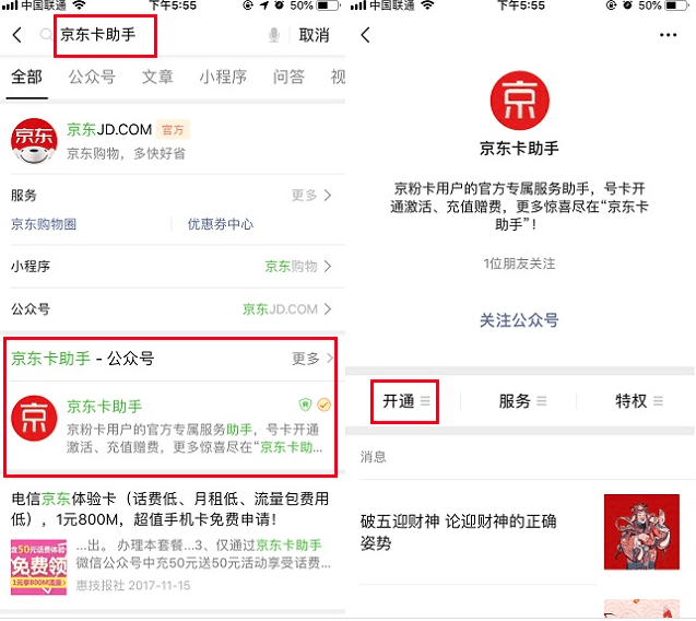 1、开通京东权益联盟卡,我们需要借助微信,在微信中搜索“京东卡助手”,进入微信公众号,然后点击“开通”。