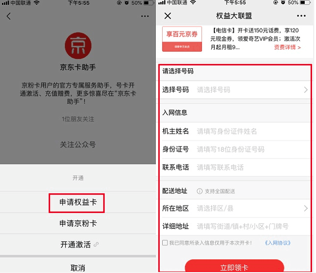 2、点击“申请权益卡”,填写相关信息,然后点击立即领卡。京东权益卡是免费领取的,初审通过后,坐等快递送SIM手机卡。